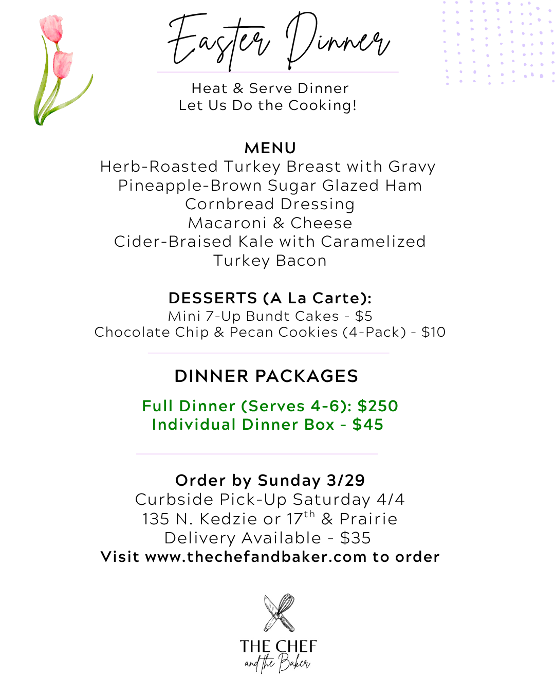 The Chef and The Baker is a Black owned catering company proudly serving Chicago, IL and surrounding areas including the Loop, River North, Lincoln Park, Wicker Park, Hyde Park, South Loop, Evanston, and Oak Park. Services include corporate catering, private dinner parties, special event catering, in-home private chef services, and drop-off catering across Chicago.